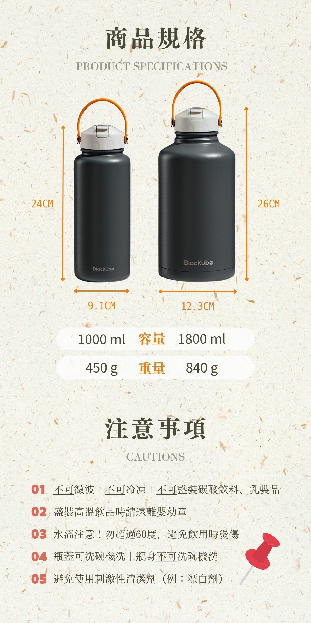 • Do not store liquids hotter than 50°C or carbonated liquids. High temperature or carbonated substances might increase internal pressure, leading to accidental leaks or eruptions when opening the cap, posing risks of clothing contamination or scalding.