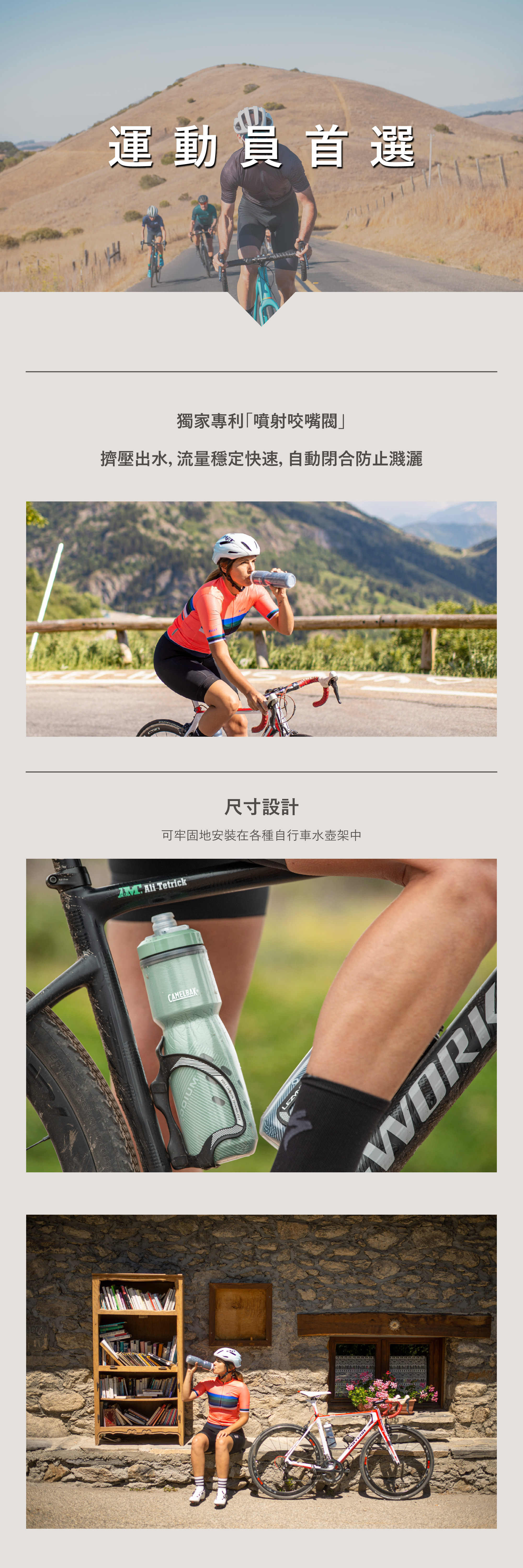 • 適合自行車、跑步等多種運動,讓運動員可以在不需停止的狀況持續補水。