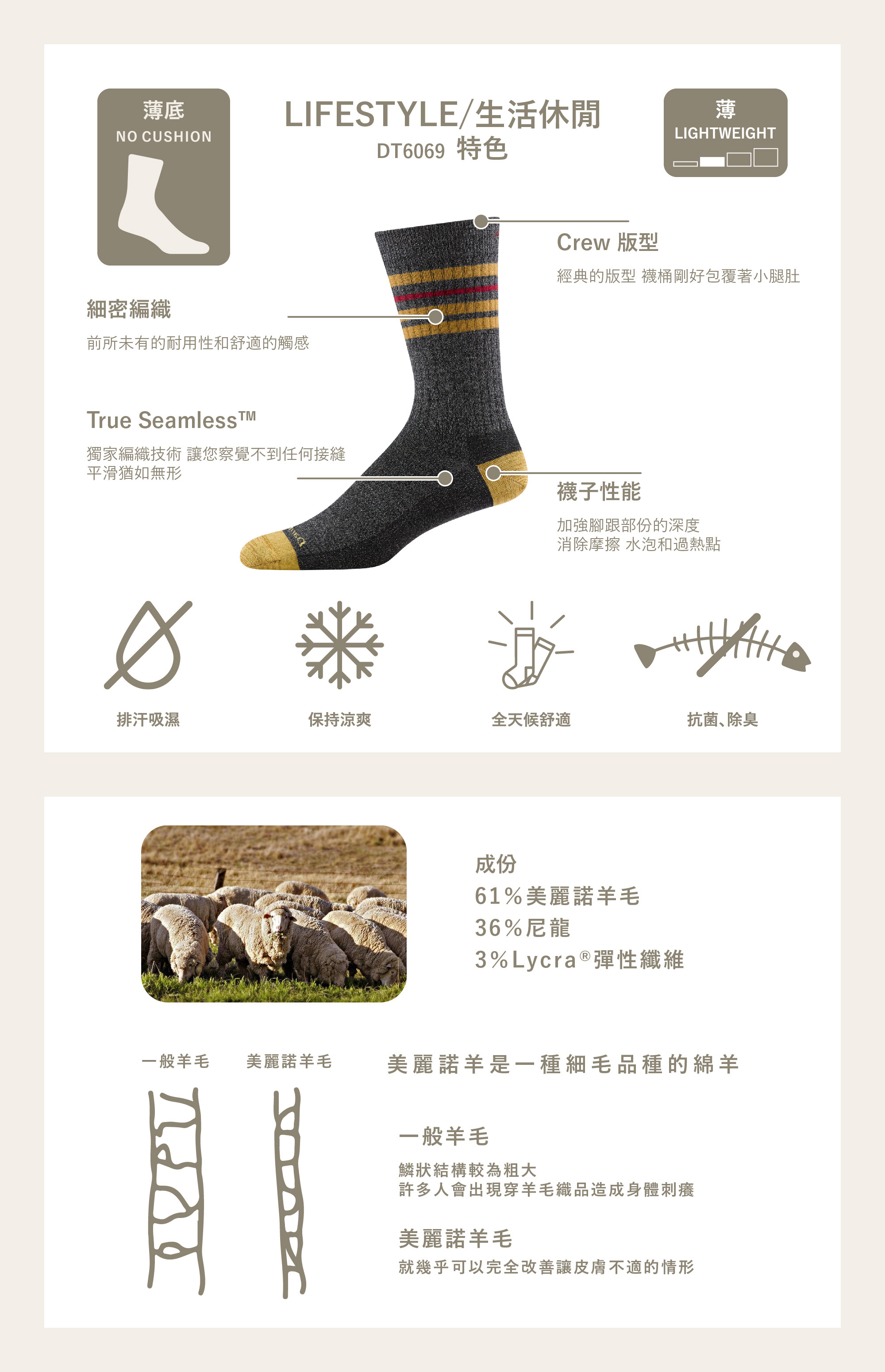• 美麗諾羊毛:在任何條件下都能保持最優良的的透氣和舒適