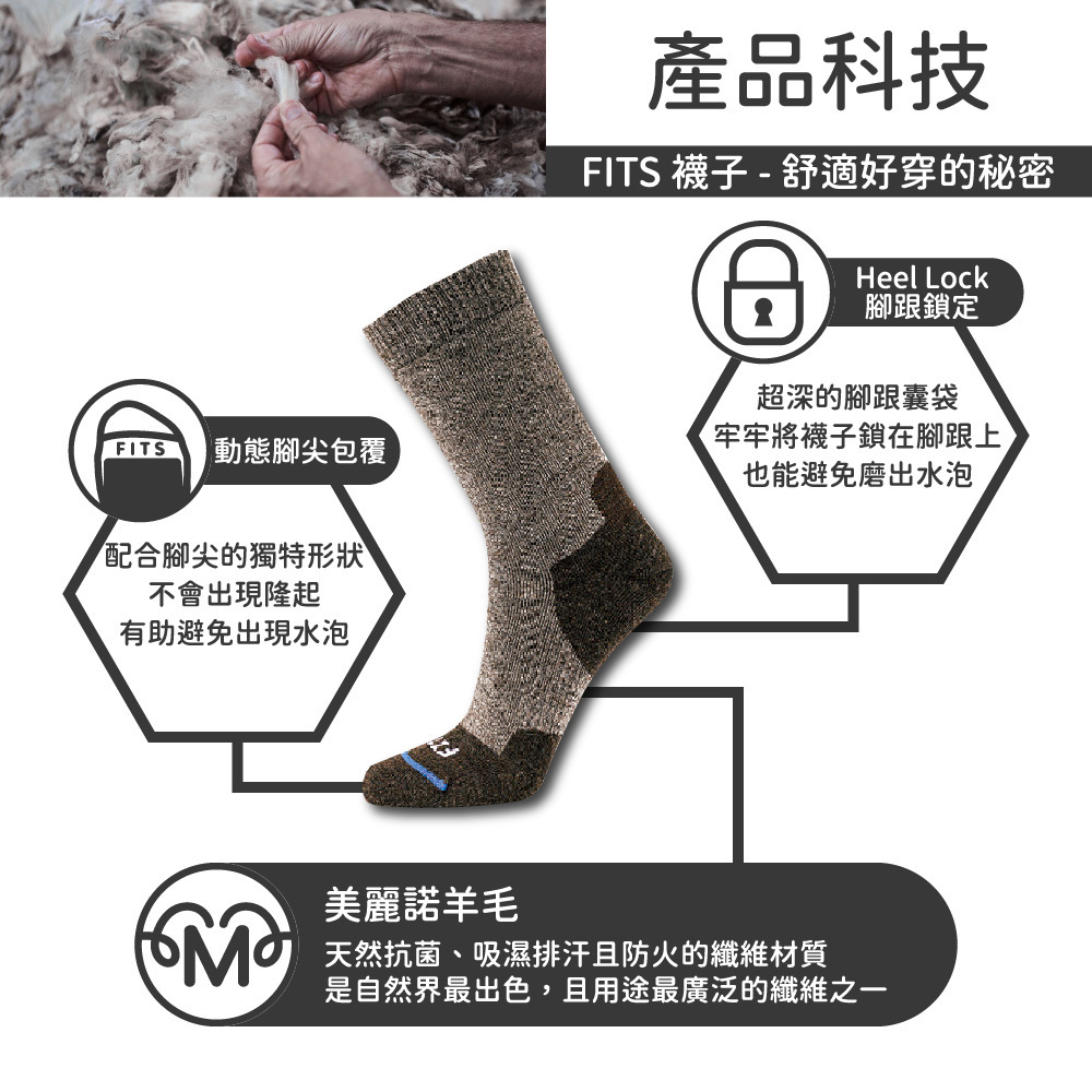 FITS結合細緻美麗諾羊毛與獨家貼合專利技術,為您的雙腳打造極致服貼、輕盈緩震且能應對多種戶外情境的最佳夥伴。