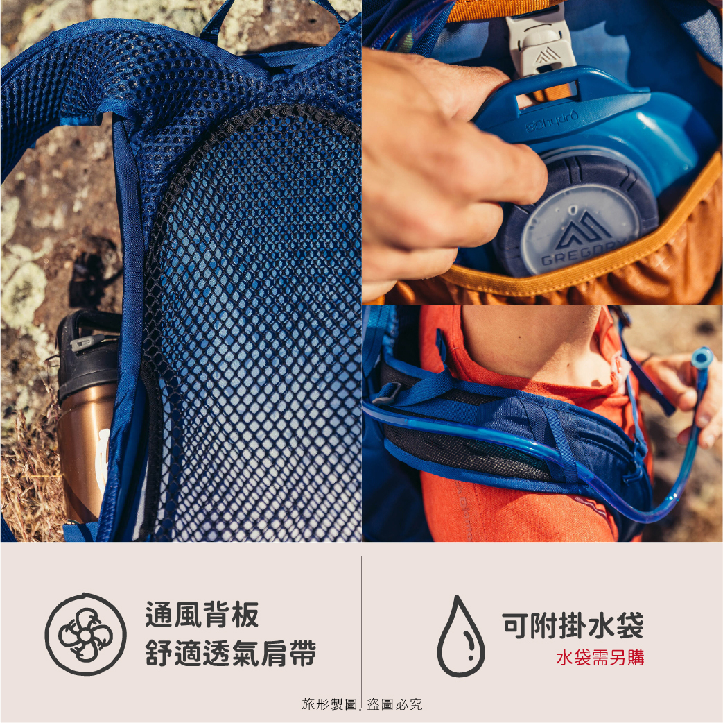 A : 可以!包包內部有水袋掛勾與放置層,也有吸管的孔洞,可固定在背帶上方便飲用。
