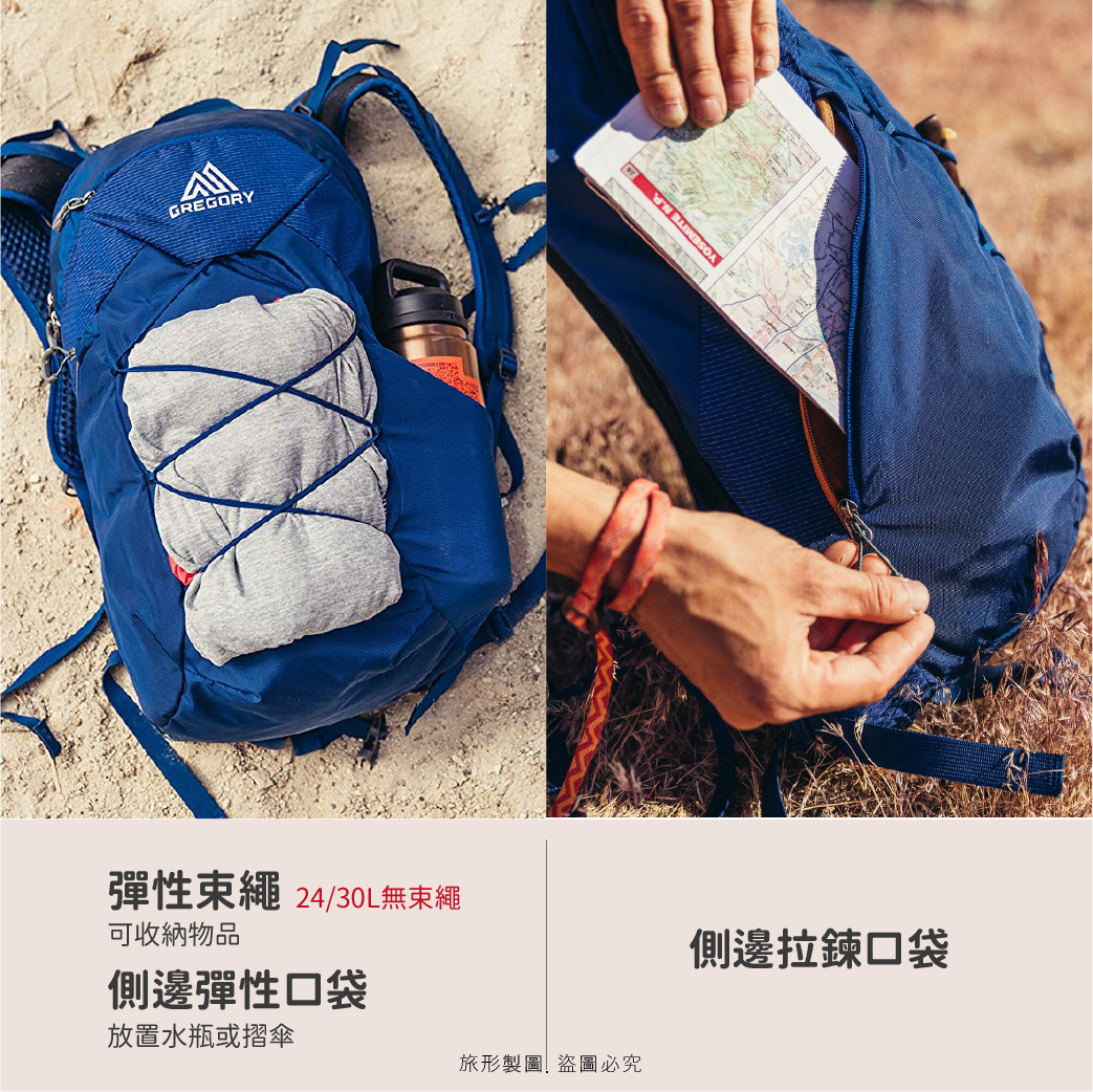 ❺ 收納:包體設計側邊一邊為拉鍊口袋,一邊為網狀袋可放置水瓶/摺疊傘