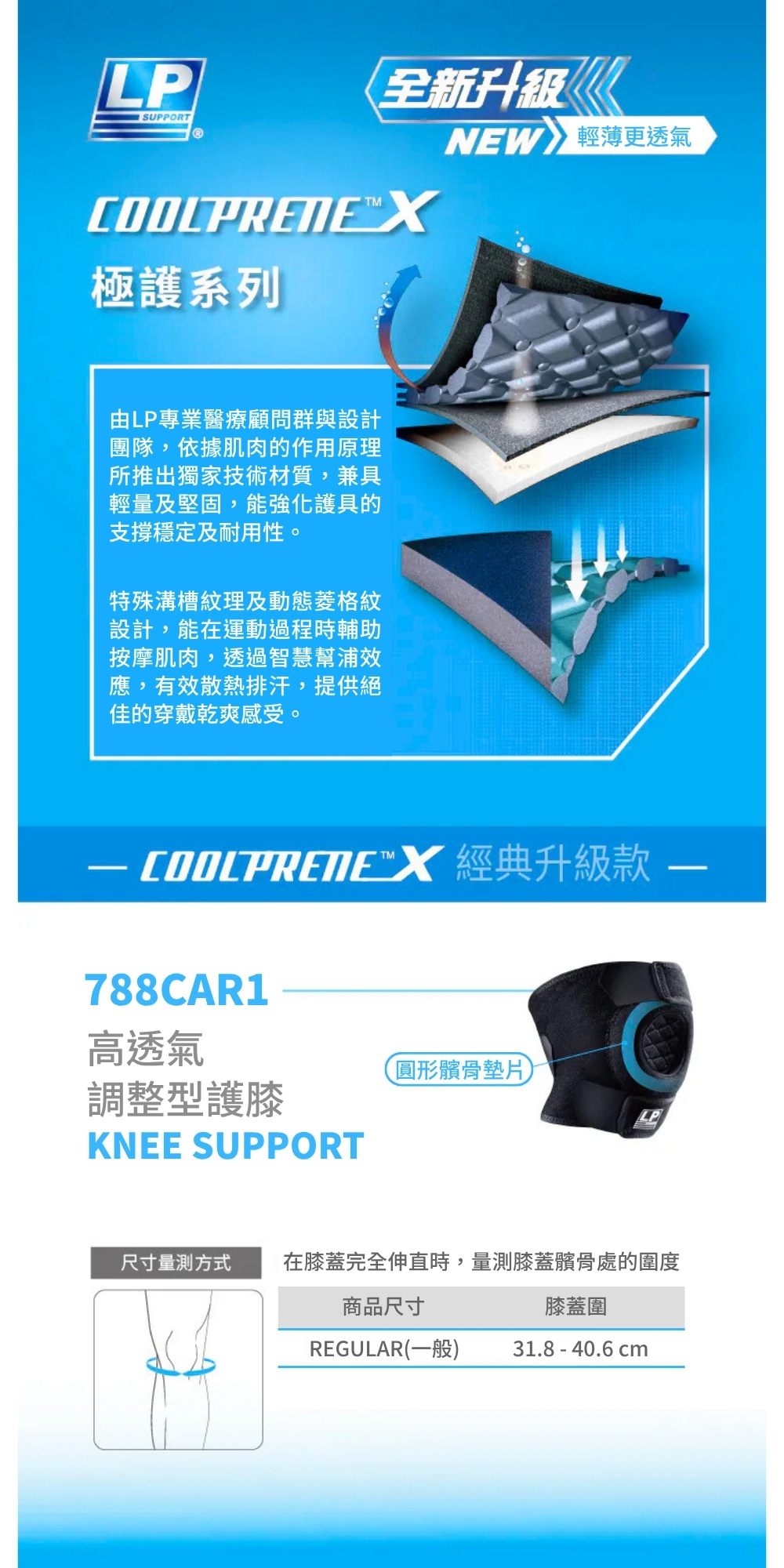 LP 788CAR1 是一款兼具高透氣與可調整功能的護膝,採用多層材質結構(表層聚酯纖維、內層聚醯胺、中間層 Neoprene)搭配 EVA 緩衝墊片設計,提供穩定支撐與良好散熱,適合多種運動及日常保護使用。