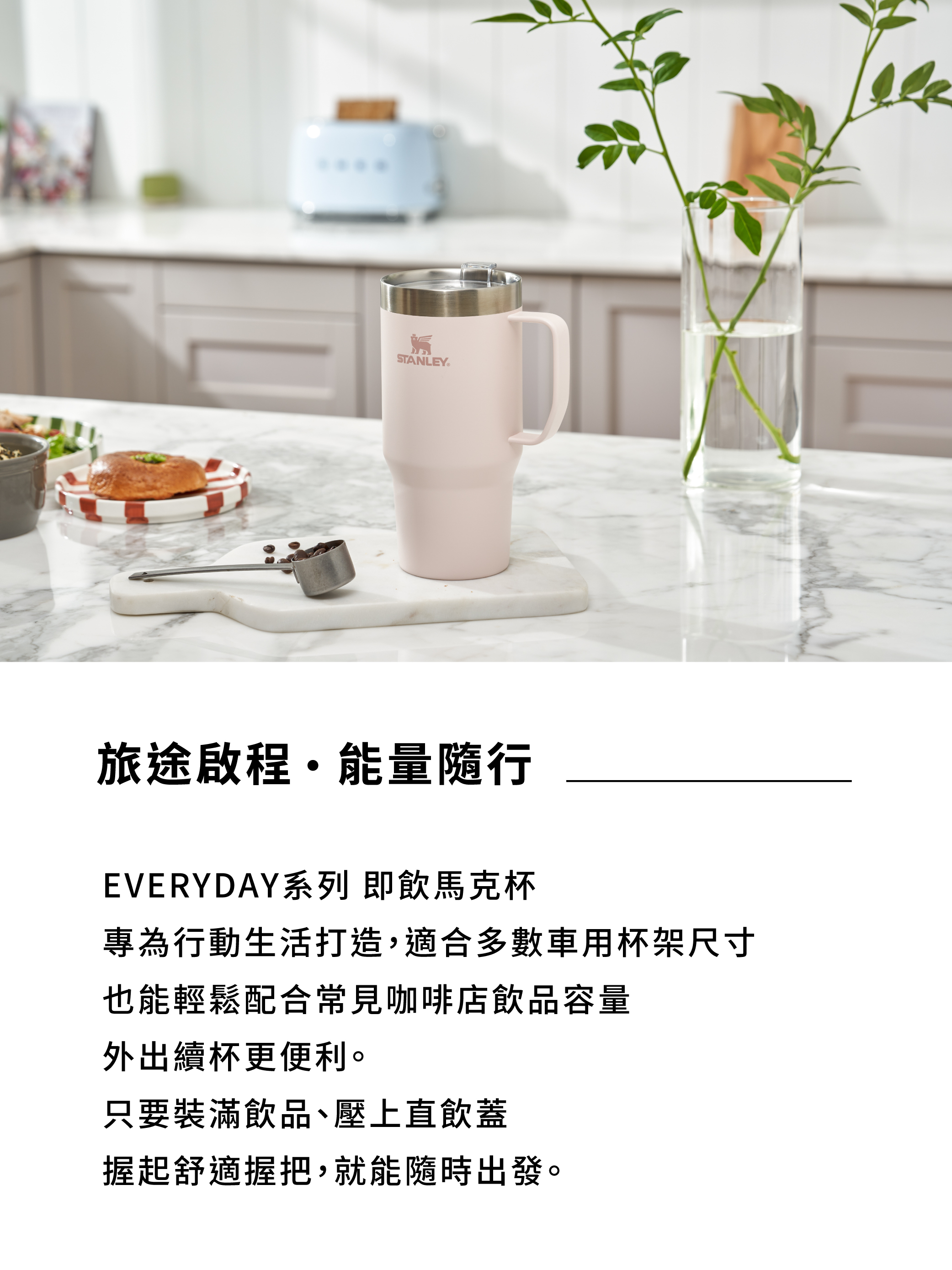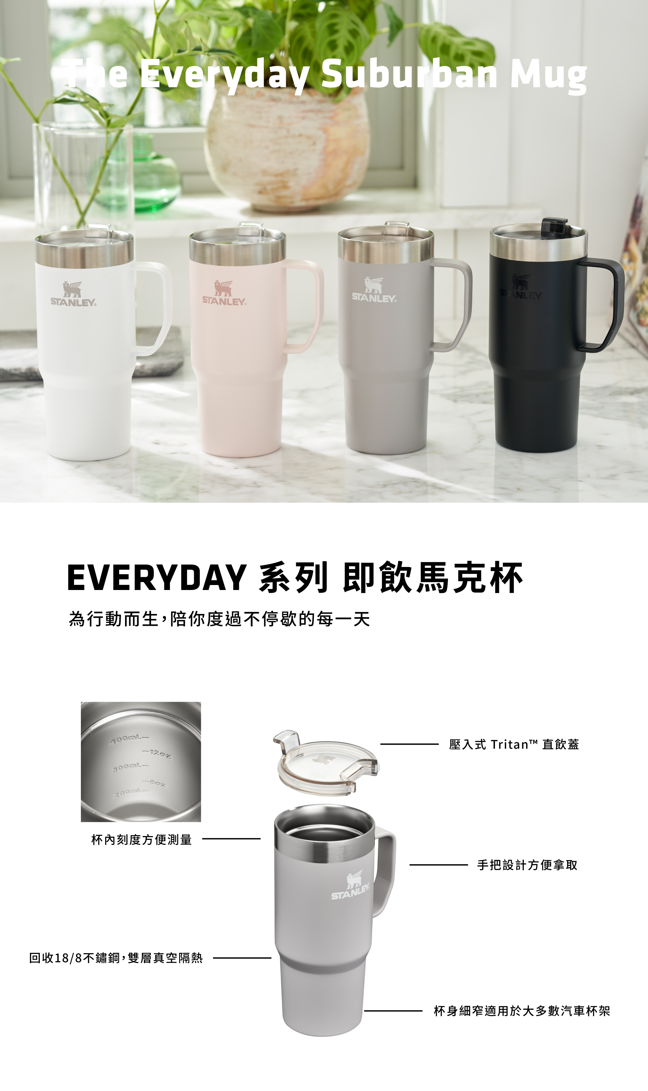 STANLEY EVERYDAY 即飲馬克杯結合卓越的保溫性能與行動便利性,是您城市探索或戶外旅程的最佳能量伴侶。